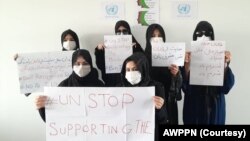 دغو میرمنو د بندو دروازو شاته په دغه غونډه کې، چې ویډیوي یې د امریکا غږ سره شریکه شوې د "طالبانو څخه ملاتړ د ښځو د حقونو څخه سرغړونه ده" ، " ملګري ملتونه دې د طالبانو څخه ملاتړ بند کړي"، "طالبان جلاد، سازمان ملل شیاد، شرم باد شرم باد" او طالبان په رسمیت مه پیژنئ" شعارونه ورکول.