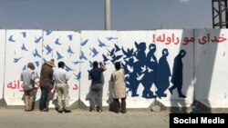 د "هنرسالار" ډلې کابل ته د هلمند د سولې حرکت د غړو راتګ لپاره د دې ښار جنوبي دروازې د (ارغندې) سيمه کې د ښه راغلاست پیغام په یوه دیوال رسم کړی.