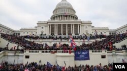 په ټولنیزو شبکو کې خپاره شوي تصویرونه او د امریکایي رسنیو ژوندۍ خپرونو ښودلي چې د ښاغلي ټرمپ پلویان د کانګرس په مخ کې د پولیسو لیکې ماتې او ماڼۍ ته ننوتل.